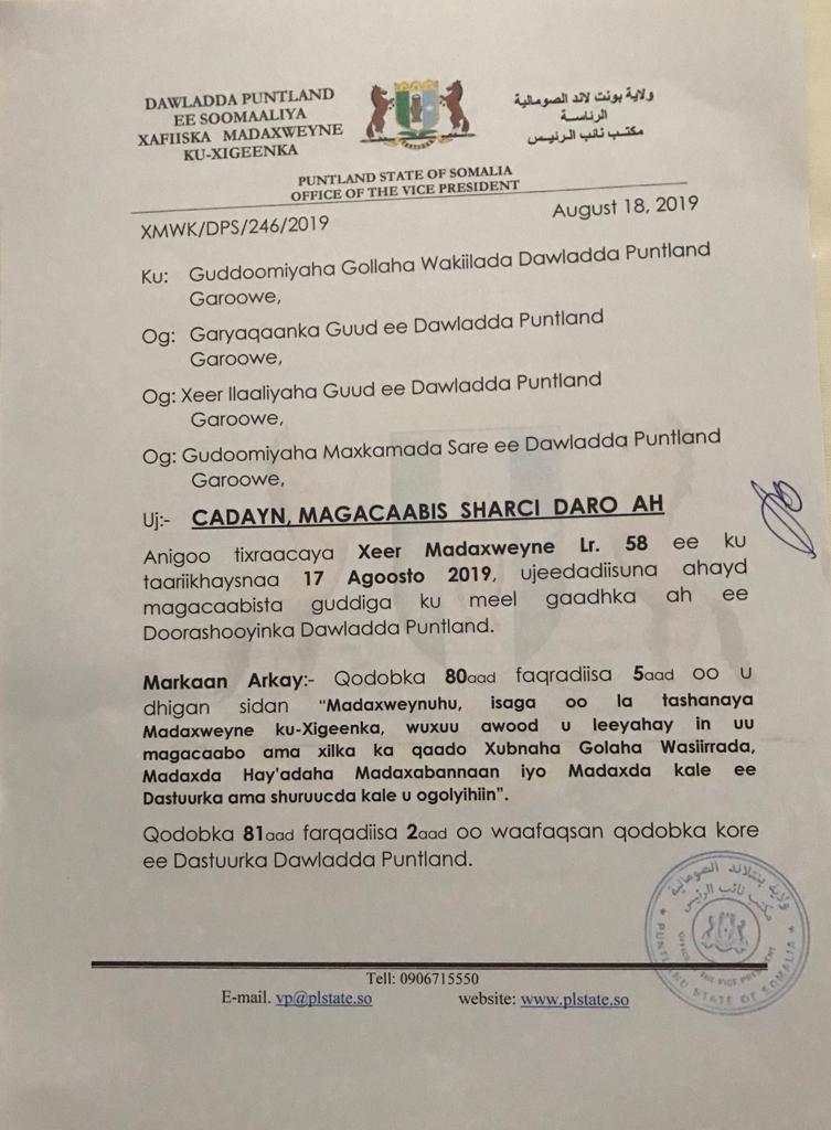 PUNTLAND VICE-PRESIDENT’S ADVICE IS NOT LEGALLY BINDING