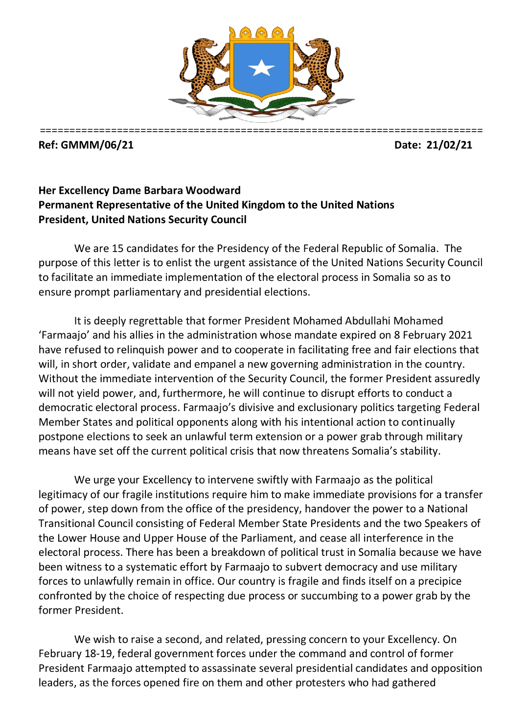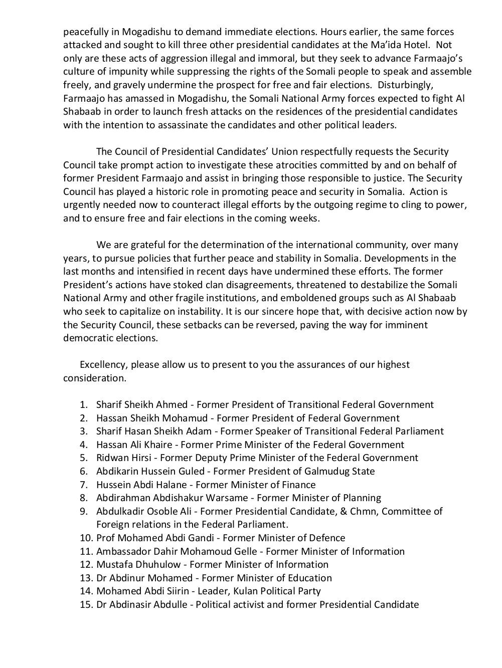 An alliance of opposition parties said in early February they would reject any attempt to extend Mohamed’s term, calling a national council of lawmakers, opposition leaders and civil society to rule until a successor was chosen.