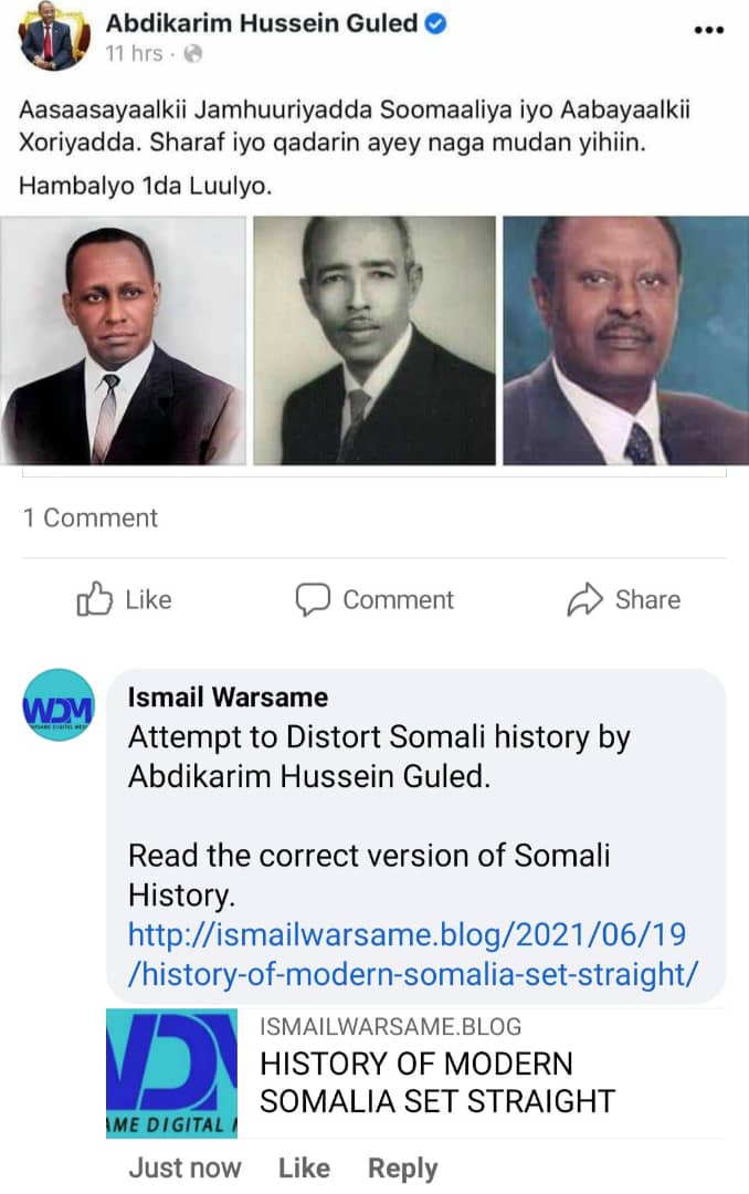 One thought on “ABDIKARIM HUSSEIN GULED CAUGHT LYING ABOUT SOMALI HISTORY”