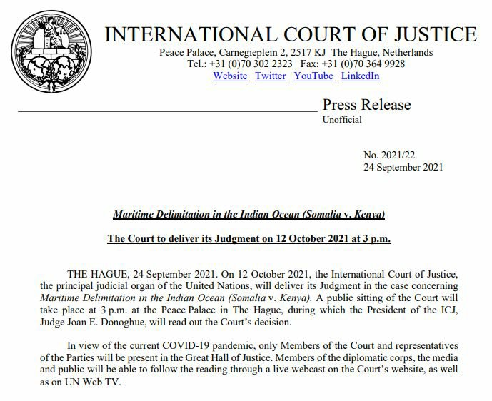 The International Court of Justice (ICJ) will announce the decision on October 12, ending a protracted case between the two neighbours that the war-torn Horn of Africa nation filed in 2014.