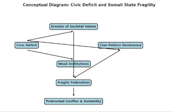 This relationship can be visualized through a conceptual model (Figure 1), which traces how the erosion of civic education cascades into institutional weakness, clan dominance, and ultimately state fragility.