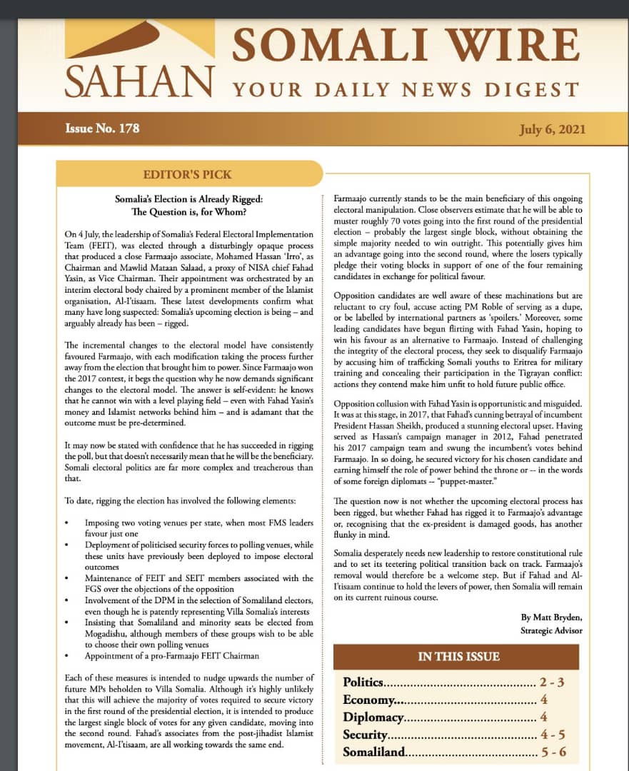 If the above reports were nearly close to the truth, there is a cloud of mistrust hanging on this election, which would make election victory by Farmajo or someone else promoted by NISA and its allies as very much a suspect.